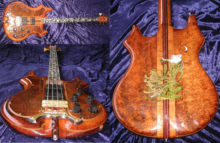 “The Garcia” was one of my very first guitar designs created in collaboration with Doug. Together we designed a line of models during the years 1974 thru 1977. There was: The Pendulous (Front and Back), The Firedrake (Front and Back), and The Garcia (Symmetrical and Asymmetrical versions). We had built a few asymmetrical Garcia’s, one bass with an arched Purple Heart top went to Phil Lesh. Jerry’s “Garcia” was completed by Doug two years after I had left D.Irwin and Company.