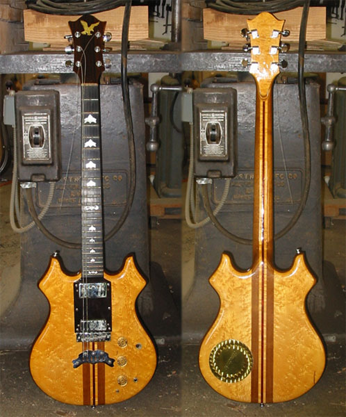 Yes, this design was originally neck-through body construction. I had rough-carved the full length Western Curly Maple/ Vermillion laminate neck blank and then the project sat for a while. It wasn’t until I began the Pete Sears project that we realized Jerry’s guitar needed to be a set neck body design, eliminating the Maple neck-through body intersection, which could only interrupt the aesthetic visual beauty of the arched Coco Bolo top.